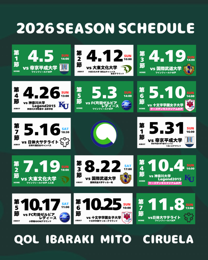 2026年4月1日 / 最終更新日時 : 2026年4月1日 mito-ciruela お知らせ 【お知らせ】2026シーズン試合日程のお知らせ いつもQOL IBARAKI MITO CIRUELAへご声援頂きまして誠にありがとうございます。2026シーズンの関東女子サッカー2部リーグの試合日程が、以下の通り発表されましたのでお知らせします。
