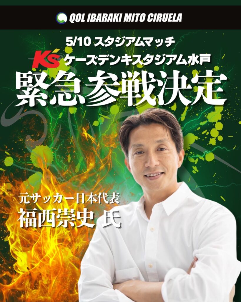 2026年4月12日 / 最終更新日時 : 2026年4月12日 shibuya お知らせ 【おしらせ】5/10(火)ケーズデンキスタジアム戦『福西 崇史』氏緊急参戦決定!! いつもQOL IBARAKI MITO CIRUELAを応援頂き、誠にありがとうございます。この度、5/10(火)に開催する、ビックスタジアムマッチ!!ケーズデンキスタジアム水戸戦にて『福西 崇史』氏の緊急参戦が決定致しましたのでお知らせいたしま。 福西 崇史 W杯・アジアカップなど数々のタイトルを制覇した元日本代表ボランチ。現在はNHK解説者として活躍中の名伯楽。 SNS Instagram/ @takashi_fuukunishiYouTube/福チャンネル