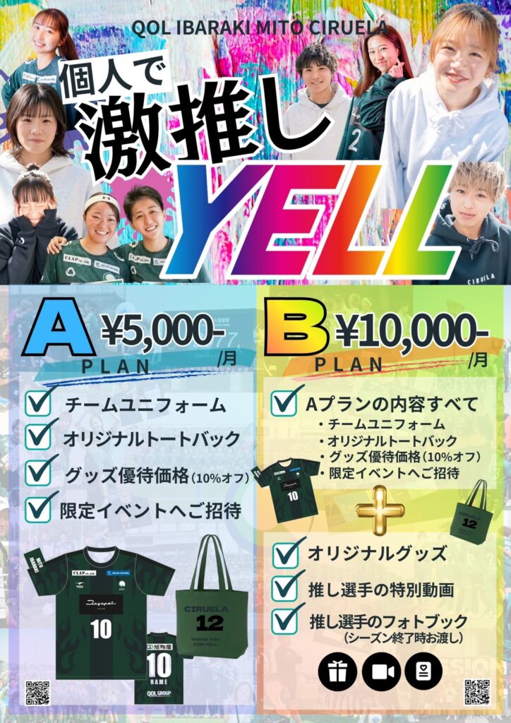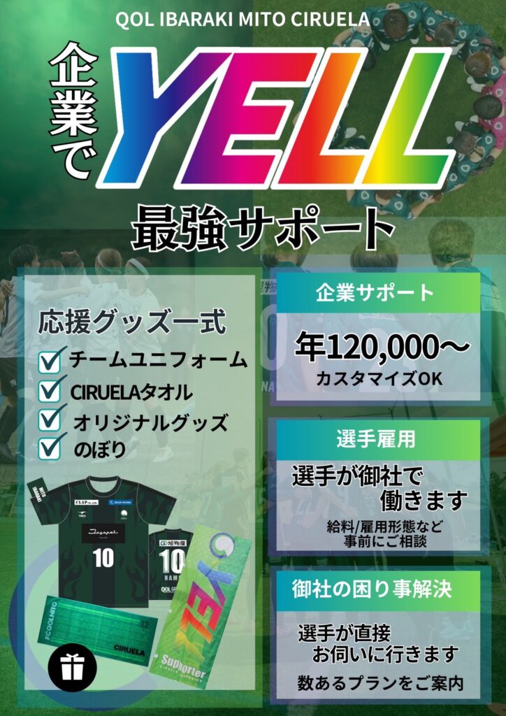 QOL IBARAKI MITO CIRUELA YELL PLAN 配信 CIRUELAでは、オフィシャルパートナーとしてクラブをご支援いただける企業様・個人様を募集しております。シルエラと共に夢と感動を追い求めましょう。ご支援賜りますようお願い申し上げます。 【月額10000円】個人様はコチラ 【月額5000円】個人様はコチラ 【企業様】お問い合わせ先 プライムパートナー オフィシャルパートナー サポートカンパニー レディースパートナー(雇用パートナー) オフィシャルサプライヤー